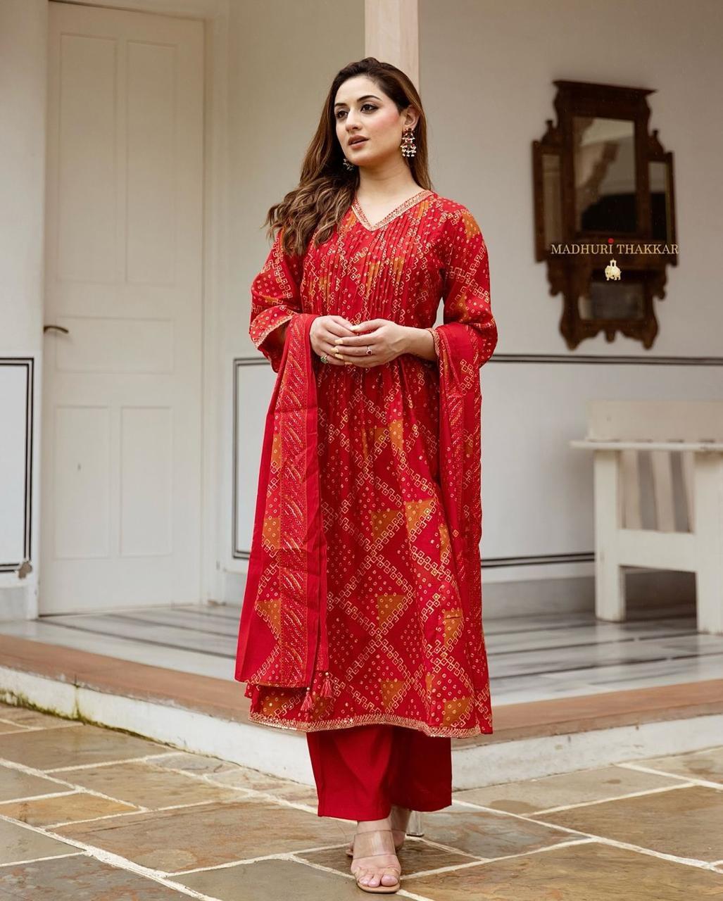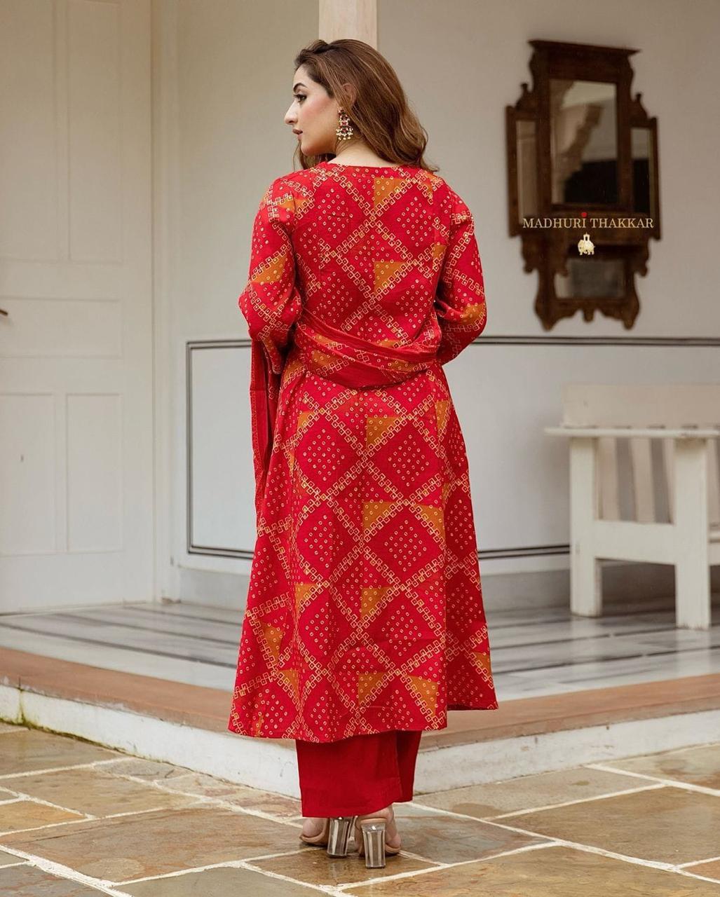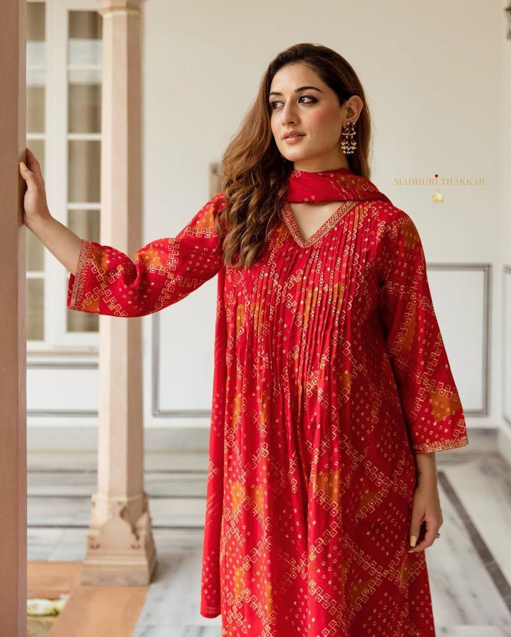 Radiate grace this Karwa Chauth in our finely crafted Red Cotton Suit with intricate embroidery and timeless Bandhani print all-over.