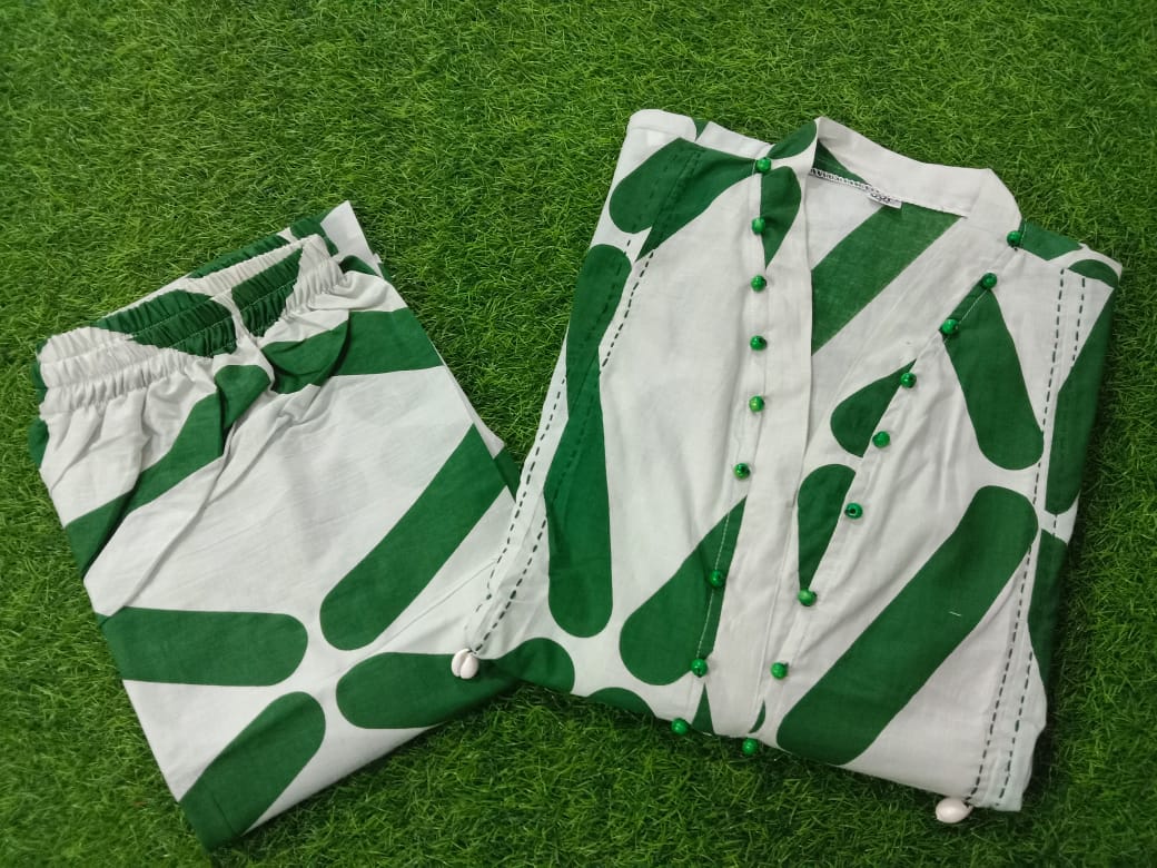 Prepare to elevate your fashion game with the Isha Clamp Co-ord Set. Made from pristine white cotton fabric, this ensemble offers a relaxed fit that ensures you look and feel your best throughout the day. Enhanced with a vibrant green geometric print, it adds a playful and contemporary touch to your look.