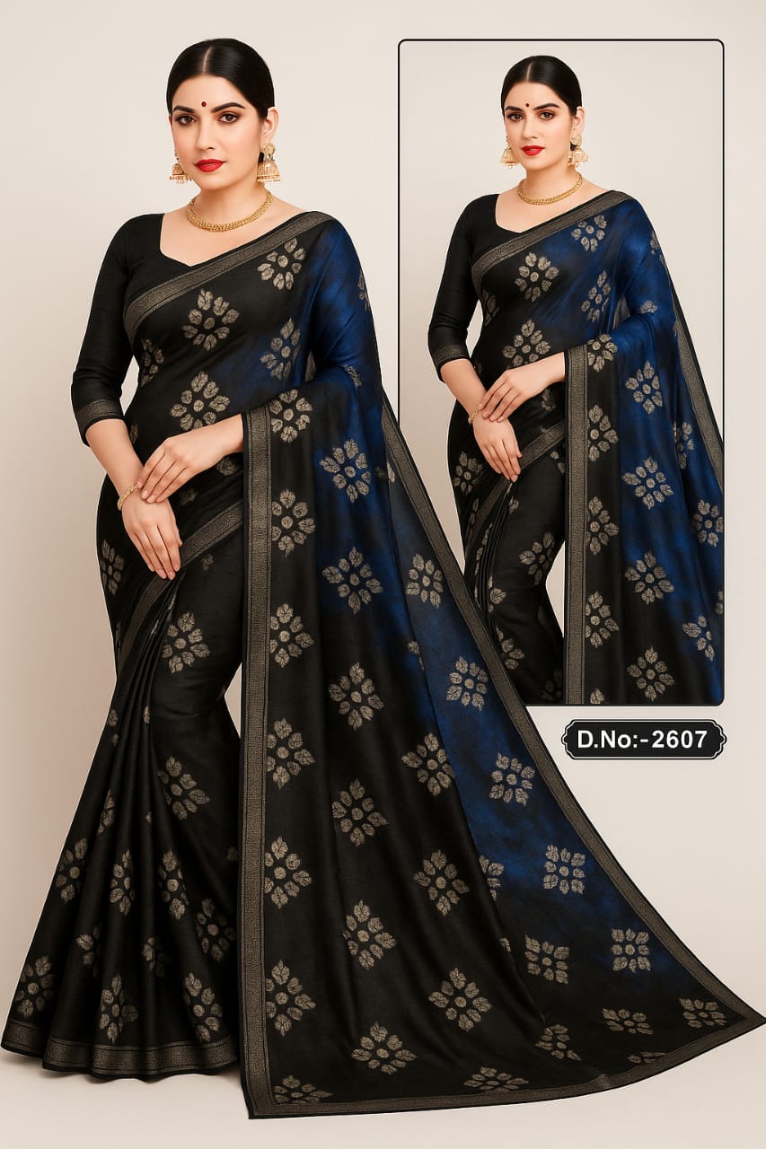 Upgrade your ethnic wardrobe with this luxurious black and blue Banarasi silk saree adorned with intricate golden floral motifs. Perfect for weddings, festive occasions, or party wear, this saree exudes traditional charm with modern elegance. The contrast blue pallu with rich zari work and the classic blouse design makes this saree a standout piece. Designed to complement all skin tones, this silk saree is a timeless addition to any Indian ethnic collection. Fabric: Banarasi Silk Work: Golden Zari Motifs Blouse: Unstitched Matching Blouse Included Occasion: Wedding, Party, Festive Wear