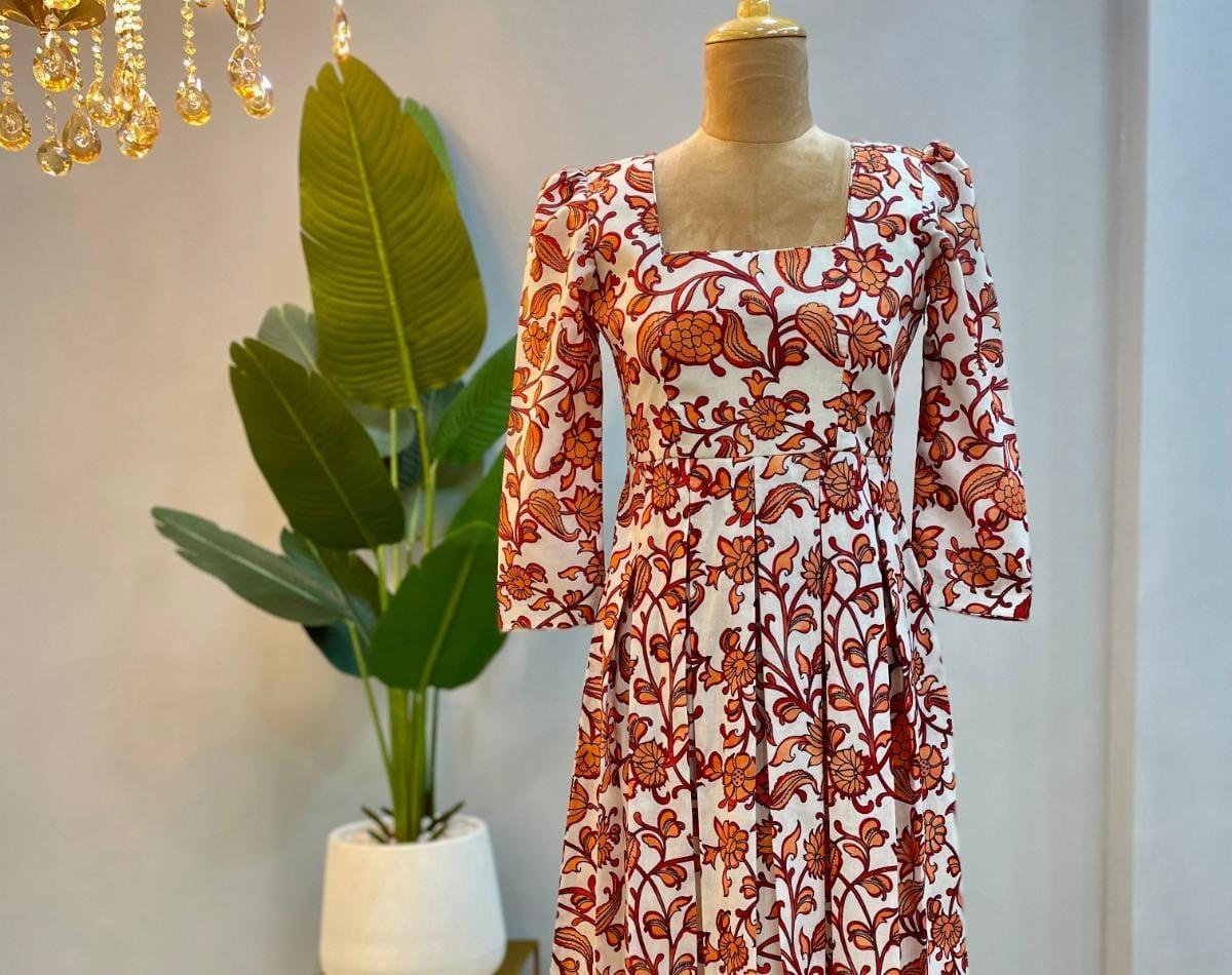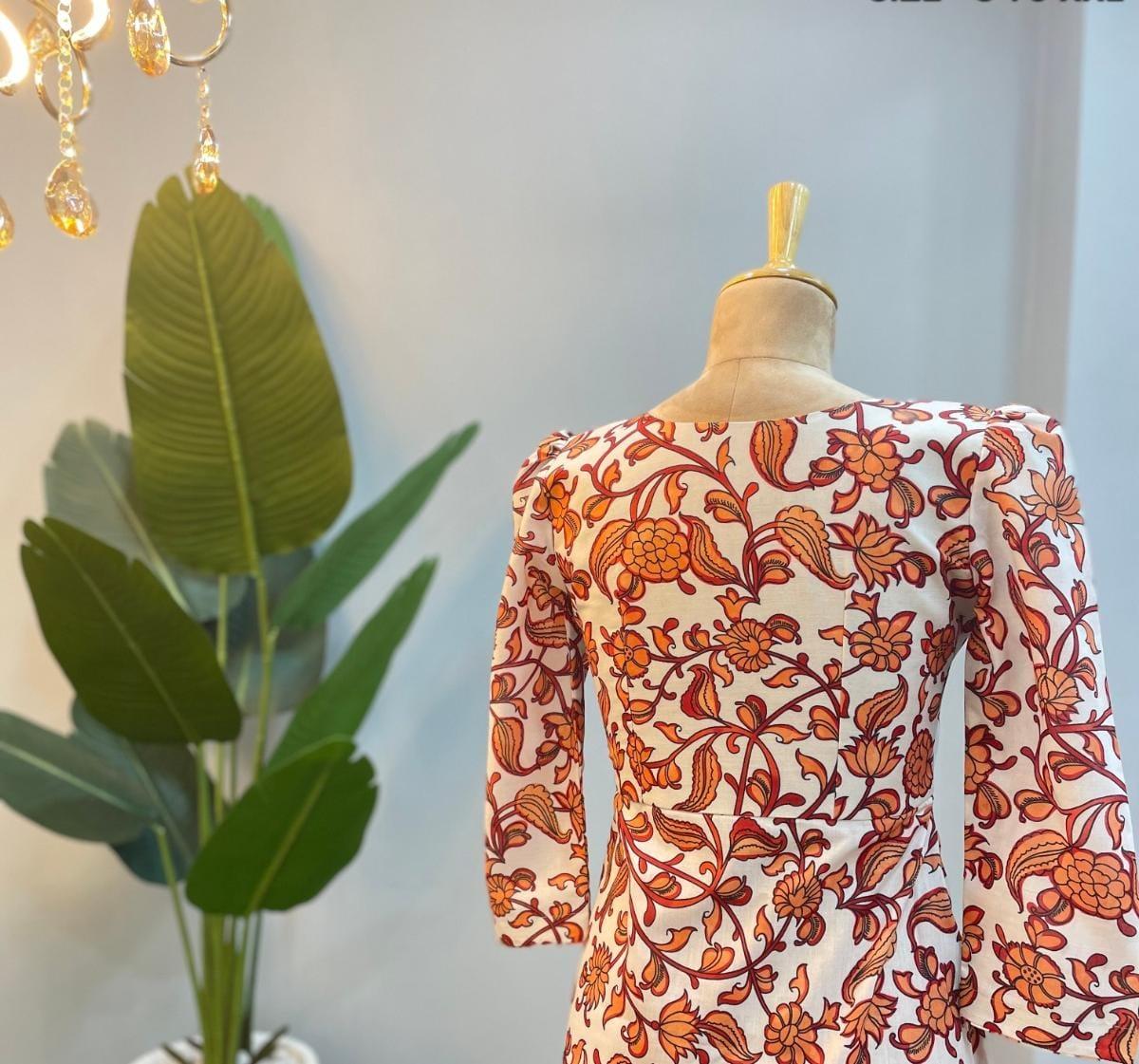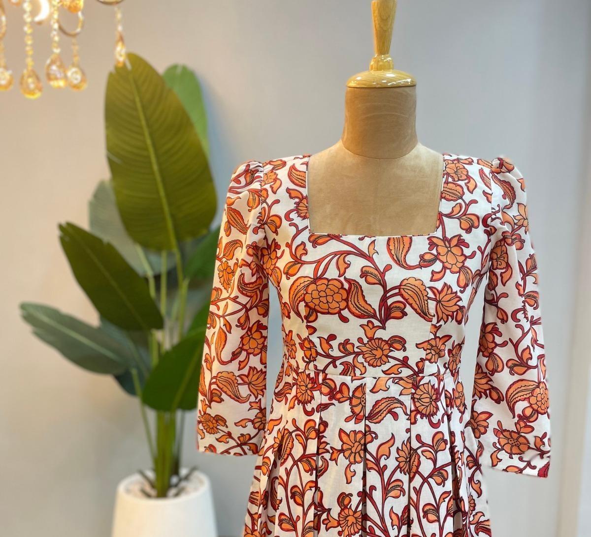 Add up one more statement kalamkari dress to your collection. Seen in an A-line silhouette, a square neck, box plits in front and back belt, puff 3/4 sleeve, and tie-up back according to fitting, this dress is all things playful and fun.