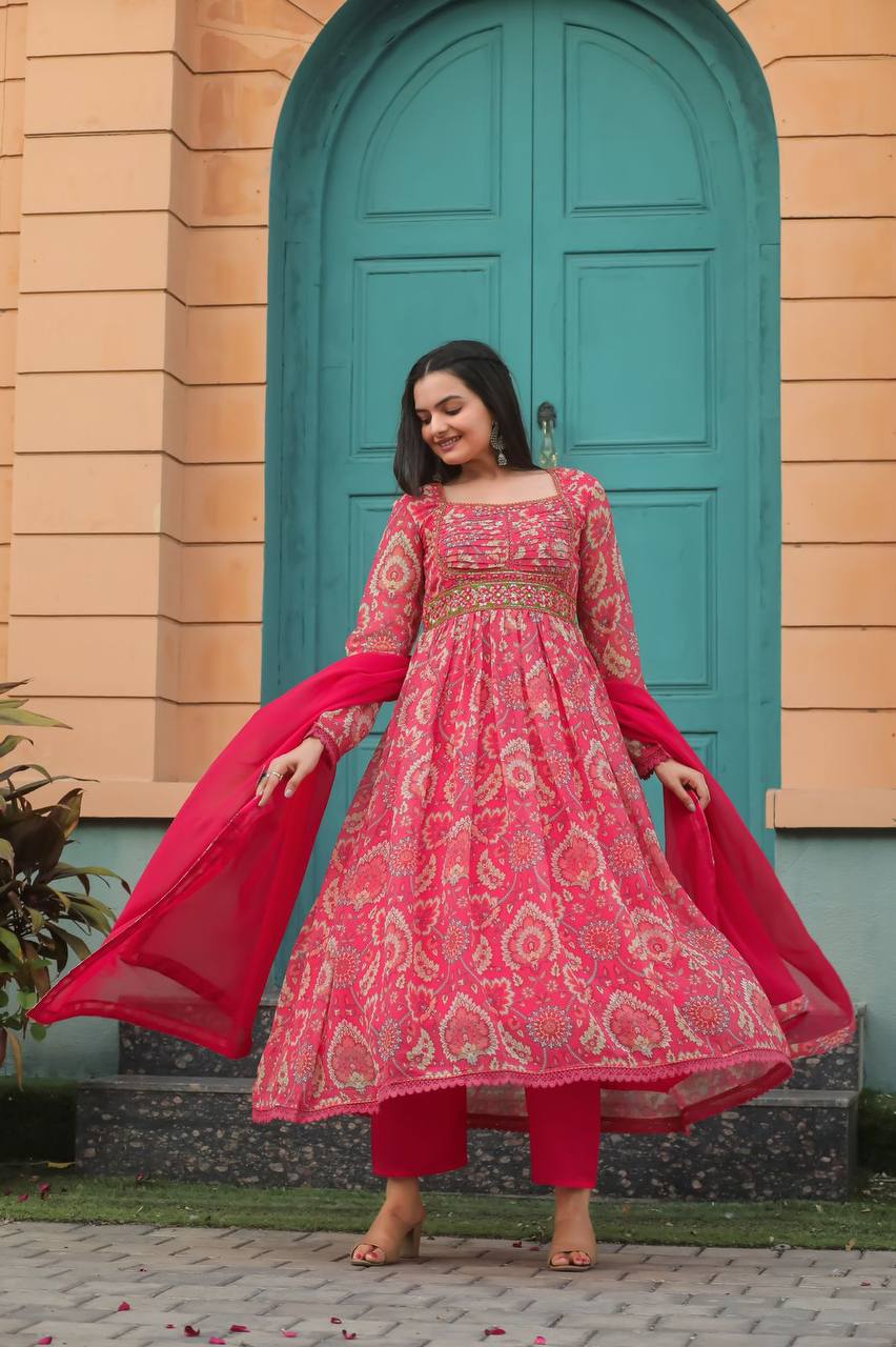 Featuring soothing yetπ georgette print and full lining with printed pent and Nazneen dupatta with embroidery work lace πelegant printing πAnarkali gown with Color. Maltiprint and pettern. It is a perfect outfit for any small gathering or function. It is very comfortable as it looks ππππ